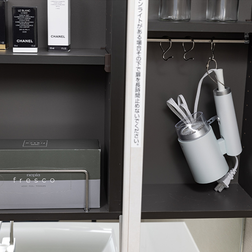 鏡裏にはティッシュボックスがすっぽりおさまるスペースと、ドライヤーなどを引っ掛けておけるフックを設置しました。