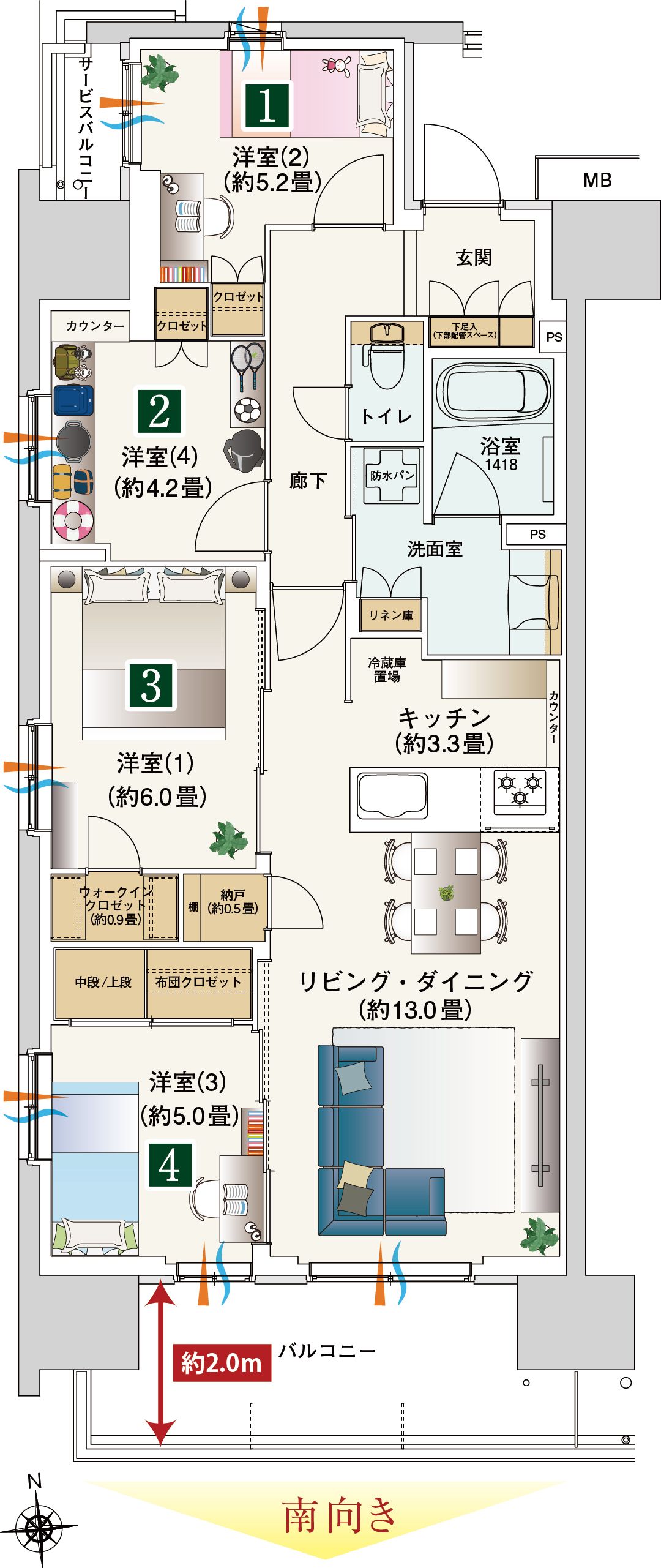 子供それぞれに1部屋ずつのスペースで、4LDKならではの暮らし方へ。