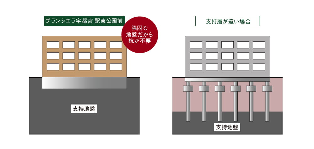 良質で堅固な地層に恵まれ、液状化のリスクも少ない建設地の支持地盤を活かして、建物基礎はベタ基礎を採用。建物全体を「面」で支える工法です。