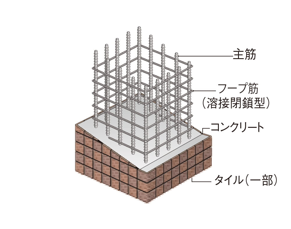 柱には、あらかじめ工場にて特殊溶接をして閉じた型にした溶接閉鎖型フープ筋を採用。地震の揺れに対して柱が粘りを持ちます。※一部除く。