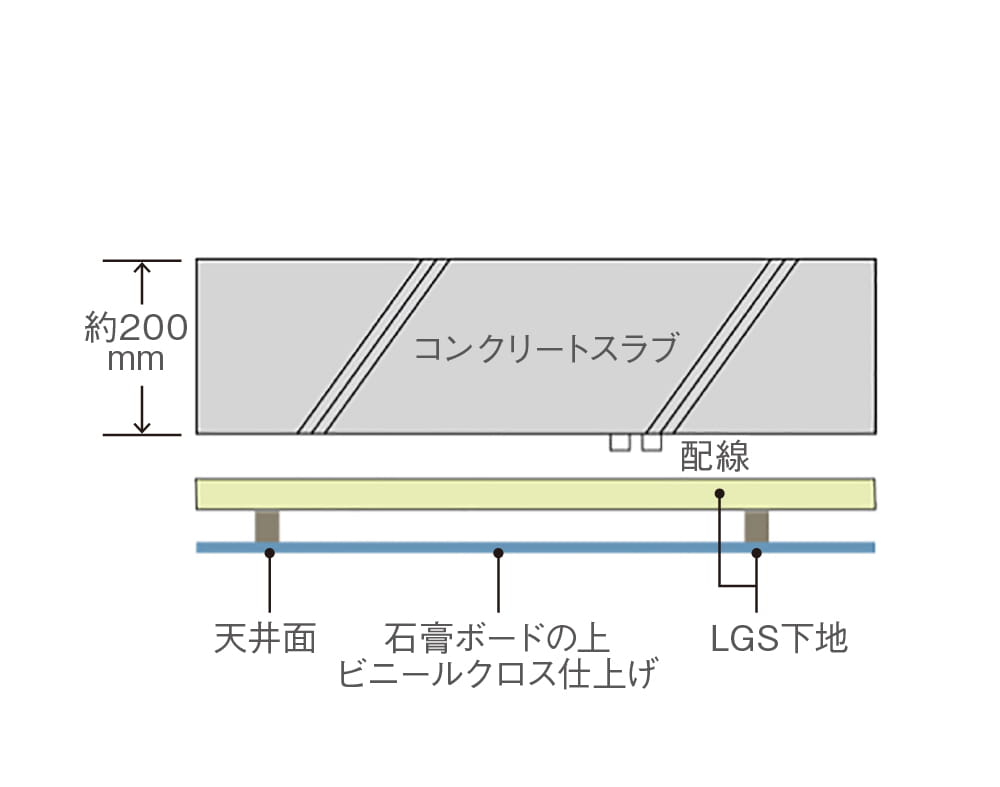 床スラブと天井面との間に配線スペースを確保した二重天井。配線をコンクリート内に行わないため、メンテナンスやリフォームが容易です。