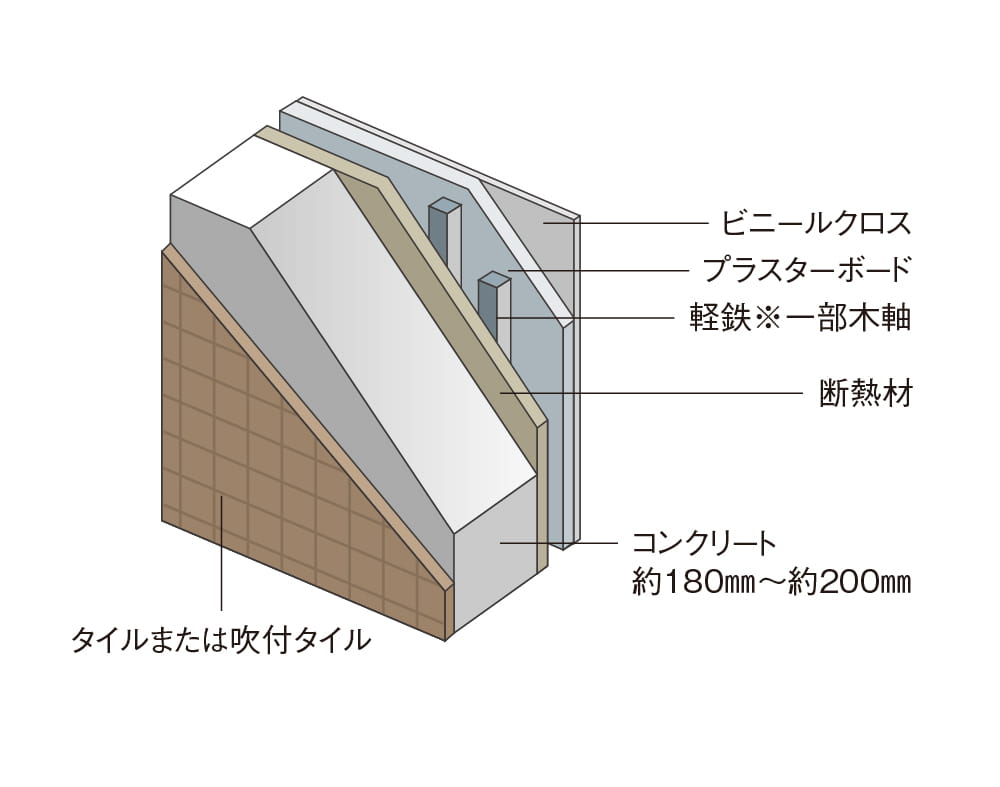 外壁の厚さは約180mm~約200mm(一部除く)を確保。室内に伝わる騒音・外気の影響を低減させ、遮音性・断熱性を向上します。