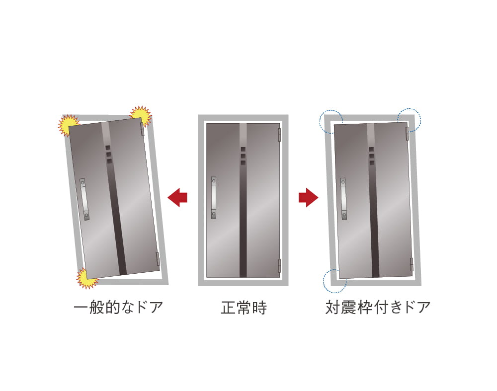 地震の際、ドア枠の変形により住戸内に閉じ込められないように、変形に対応する対震枠を採用。避難路を確保し、安全性を高めます。