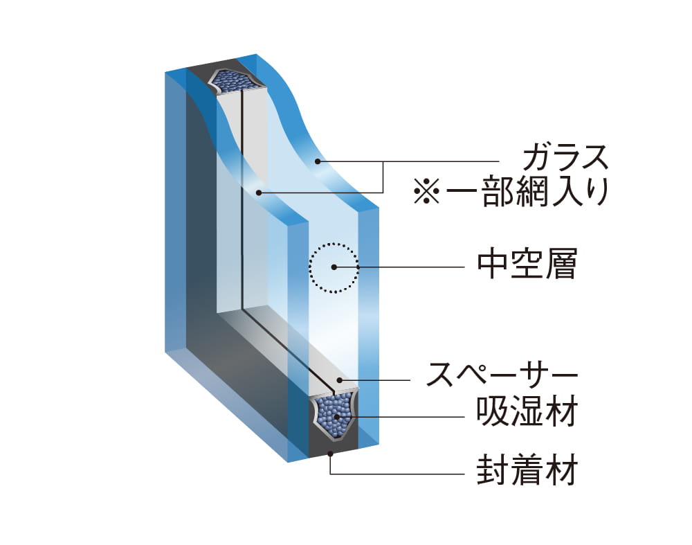 二枚のガラスの間にクリアランスを設け重ね合わせた複層ガラスを採用。断熱効果を高めるだけでなく、結露防止にも効果を発揮します。