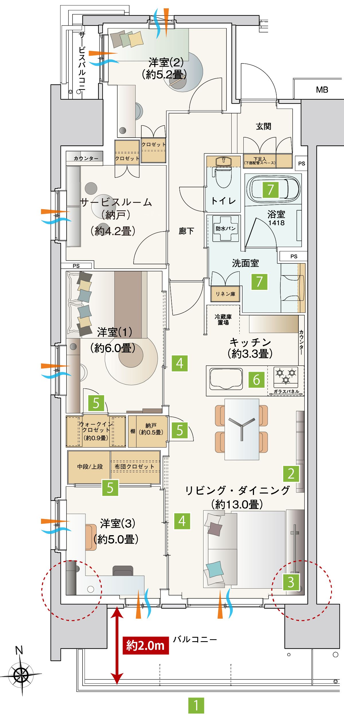 - 通風・採光に配慮し3面に窓を設けた開放的な角住戸プラン。