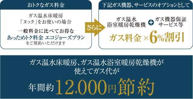 エコジョーズとガス温水床暖房の採用により、ガス使用量に関わらずガス料金の割引制度が適用されます。さらにガス温水浴室暖房乾燥機やサービスの採用でさらにガス料金が割引きされます。
