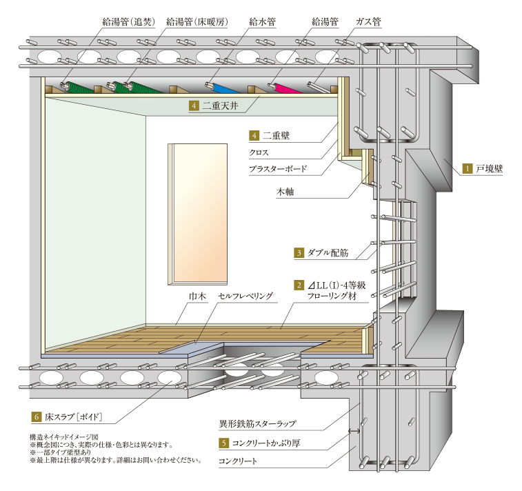 コンクリートと木軸の間に隙間を設けて、従来は躯体内に埋め込まれていた配線・配管類を敷設。点検・補修を容易にします。