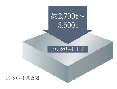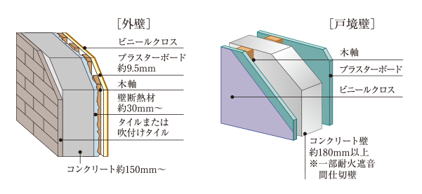 外壁の厚さはRC150mm以上。隣接住戸との間のコンクリート厚は約180mm以上としています。