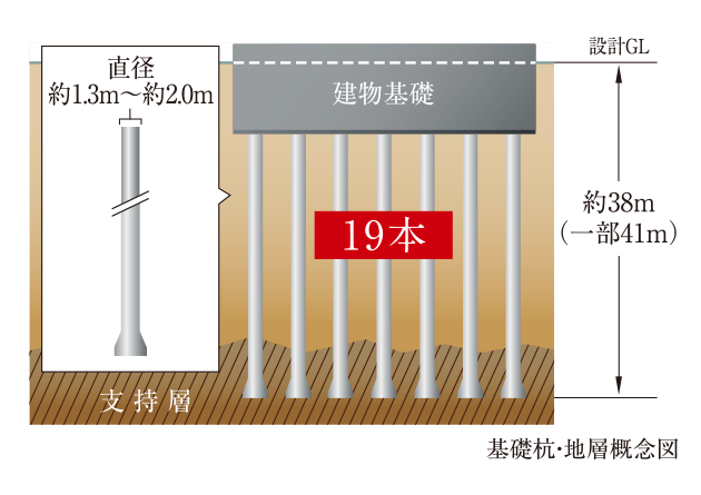 各住戸の床のコンクリートスラブ厚は、約230〜250㎜としました。遮音性に配慮した仕様です。(一部除く)