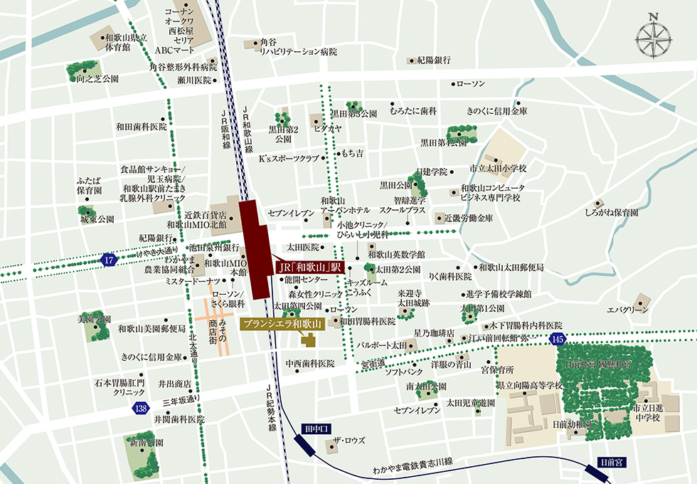 JR「和歌山」駅前の「近鉄百貨店」や「和歌山MIO」を自在に使いこなせることはもちろん、普段使いに便利な複数の商業施設が徒歩圏内に揃っていることも、この地の暮らしやすさのポイントです。