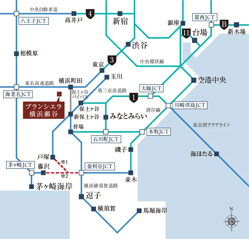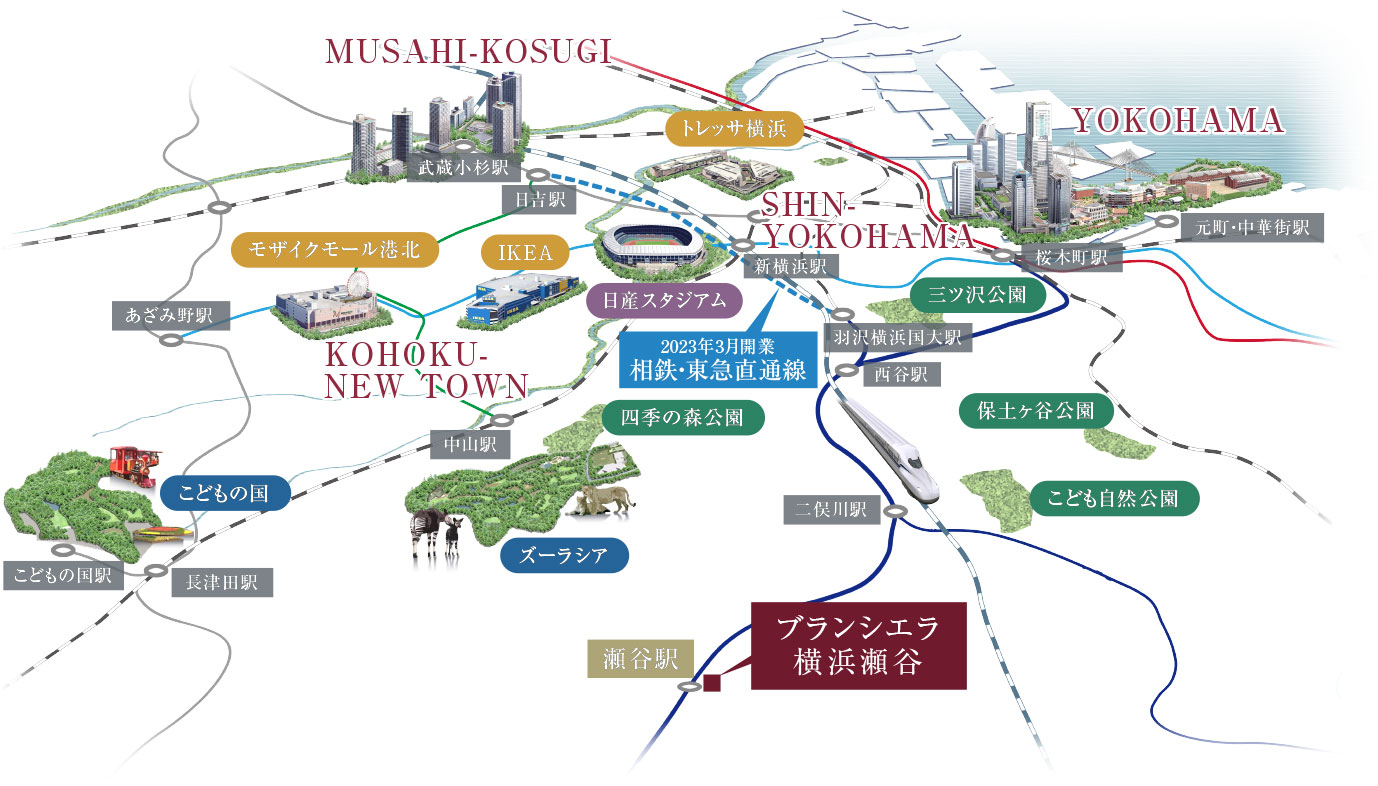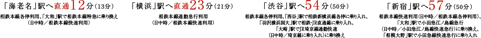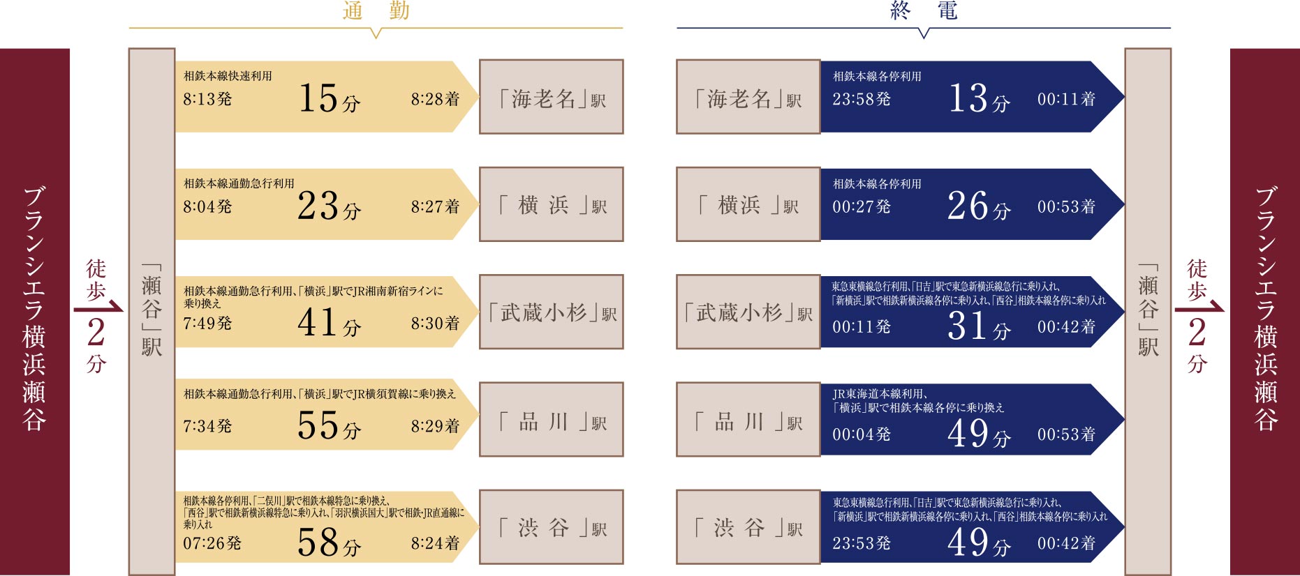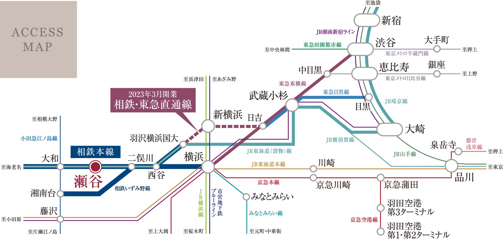 ※【瀬谷駅より】「海老名」駅:相鉄本線各停利用、「大和」駅で相鉄本線特急に乗り換え12分(日中時/相鉄本線快速利用13分)・「横浜」駅:相鉄本線通勤急行利用23分(日中時/相鉄本線快速利用21分)・「渋谷」駅:相鉄本線各停利用、「西谷」駅で相鉄新横浜線各停に乗り入れ、「羽沢横浜国大」駅で相鉄・JR直通線に乗り入れ、「大崎」駅でJR埼京線通勤快速に乗り換え54分(日中時/相鉄本線各停利用、「西谷」駅で相鉄新横浜線各停に乗り入れ、「羽沢横浜国大」駅で相鉄・JR直通線に乗り入れ、「大崎」駅で埼京線に乗り入れ50分)・「新宿」駅:相鉄本線快速利用、「大和」駅で小田急江ノ島線急行に乗り換え、「相模大野」駅で小田急線快速急行に乗り入れ57分(日中時/相鉄本線各停利用、「大和」駅で小田急江ノ島線快速急行に乗り換え、「相模大野」駅で小田急線快速急行に乗り入れ50分)