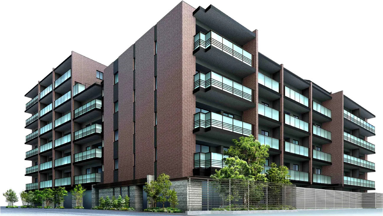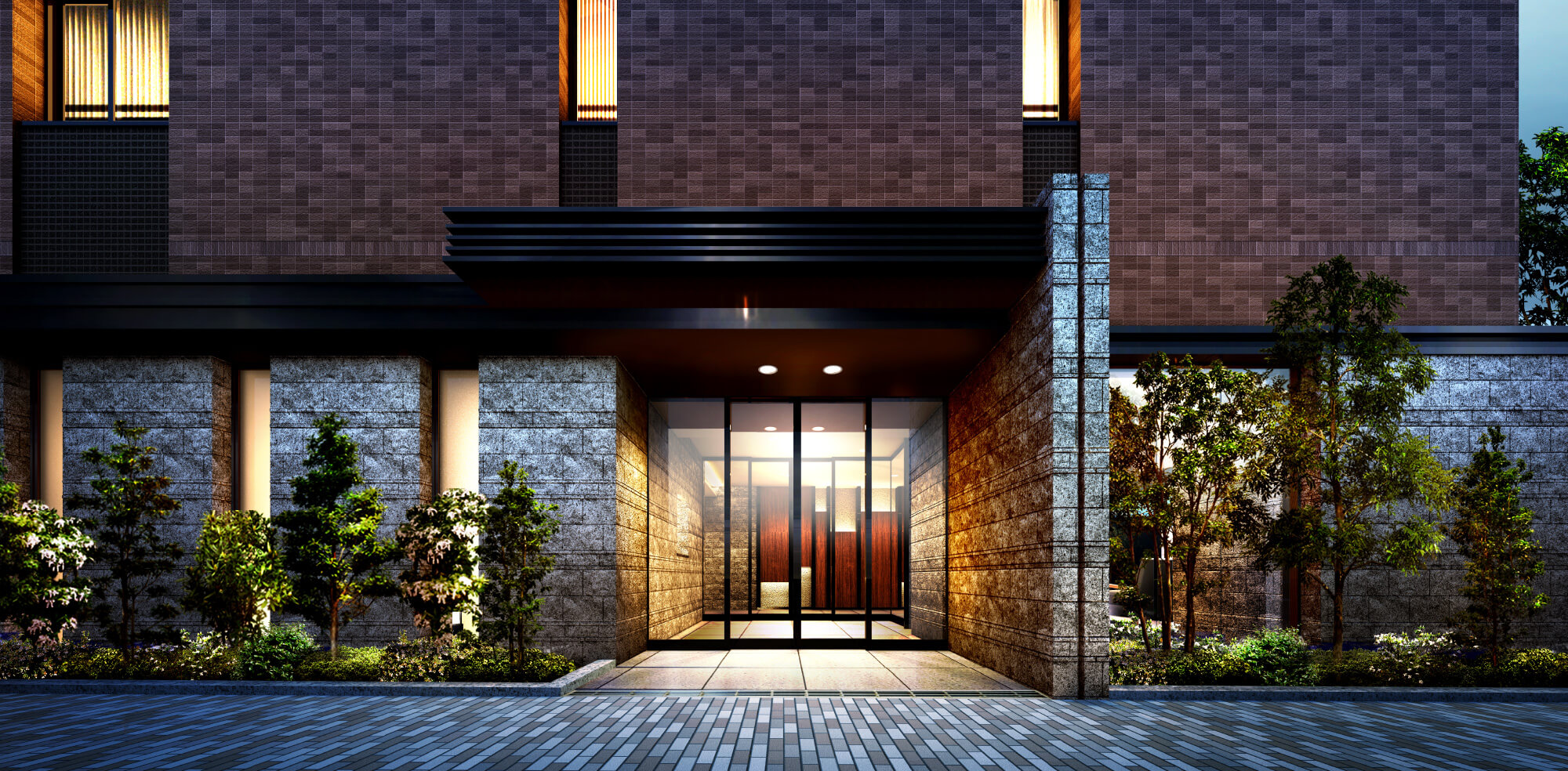 外壁には赤茶色のタイル、基壇部にはグレーのタイルとダークブロンズの庇を採用し、重厚感のある邸宅を演出。バルコニーにはスタイリッシュなガラス手摺を施すことで、洗練された都市邸宅の風景を創出します。