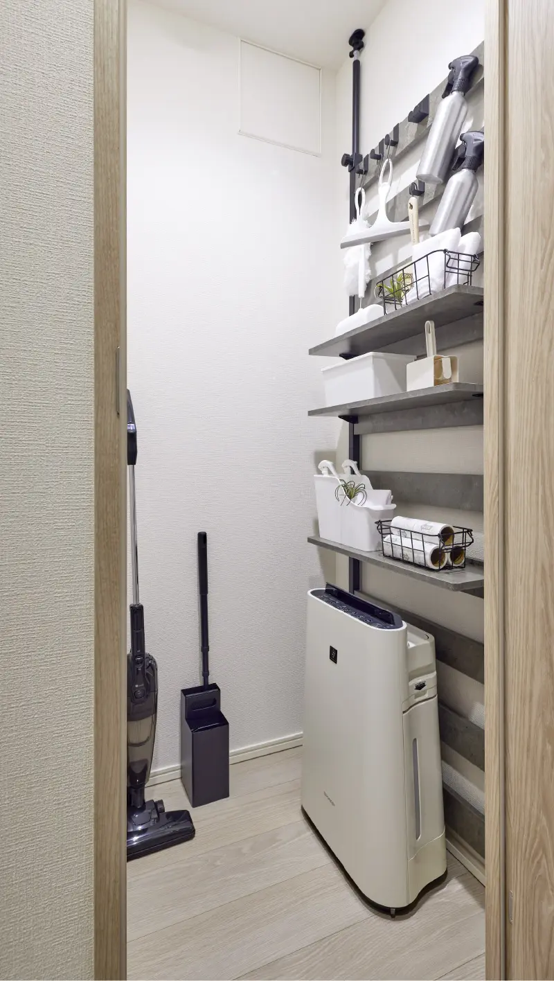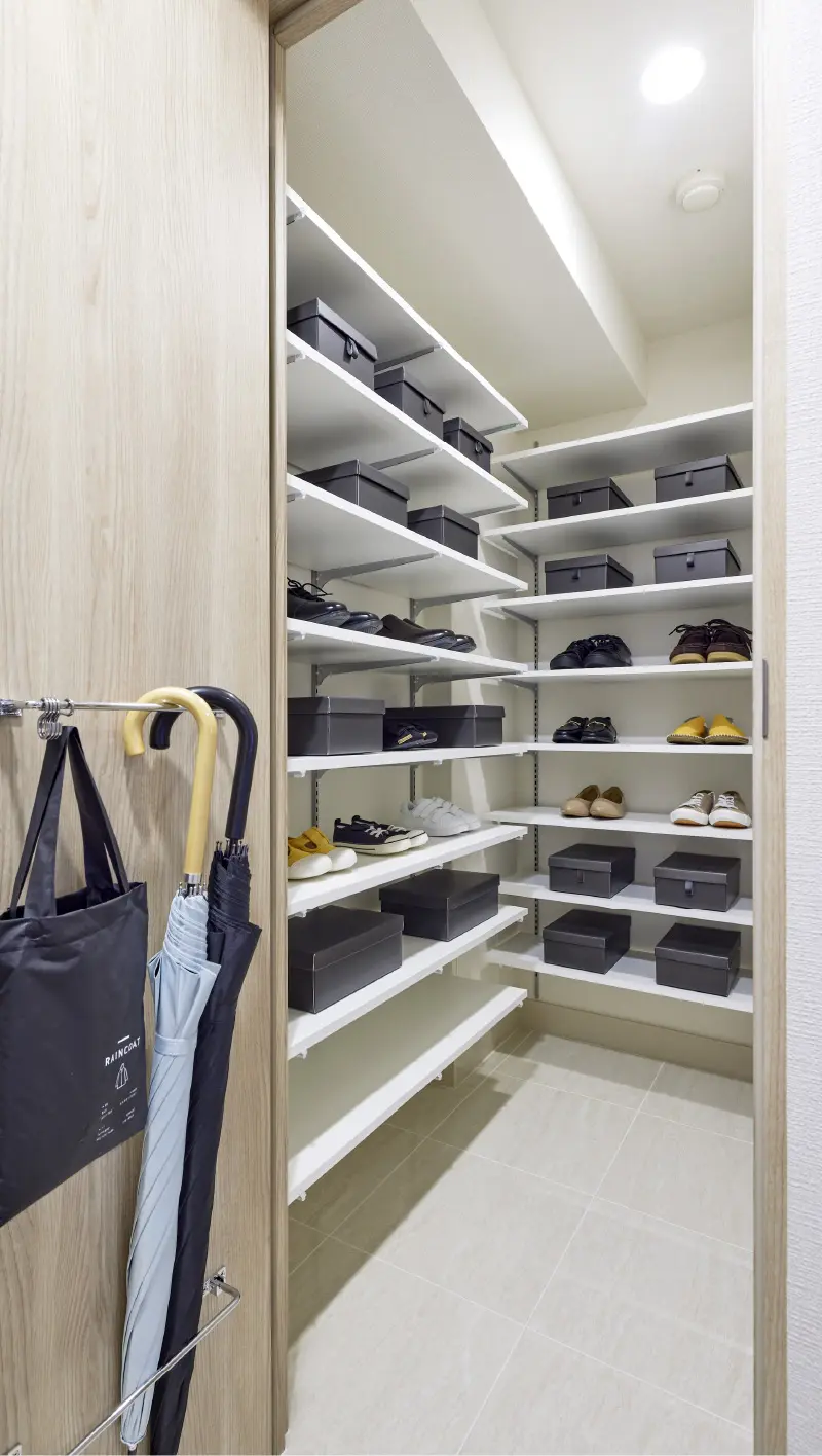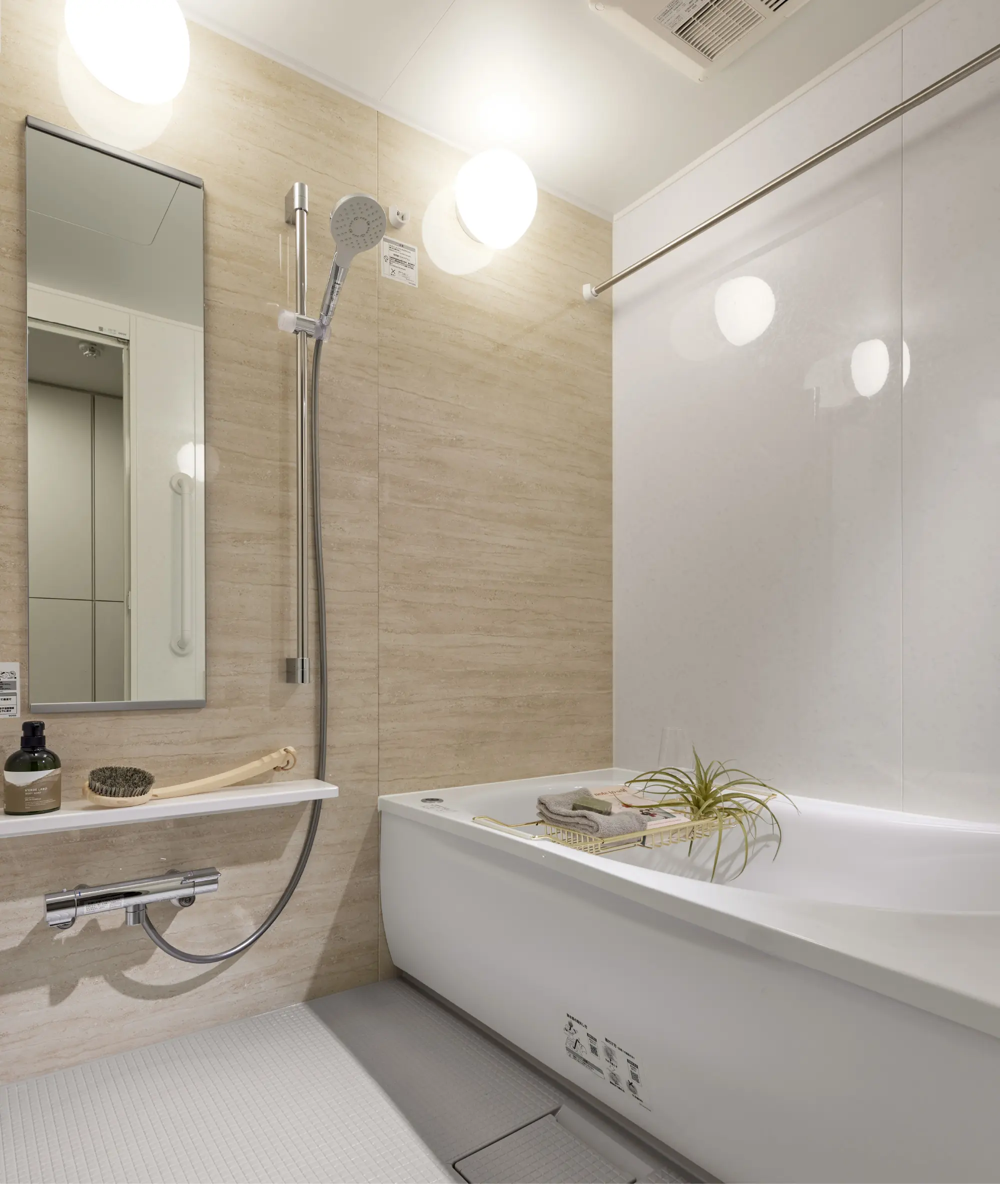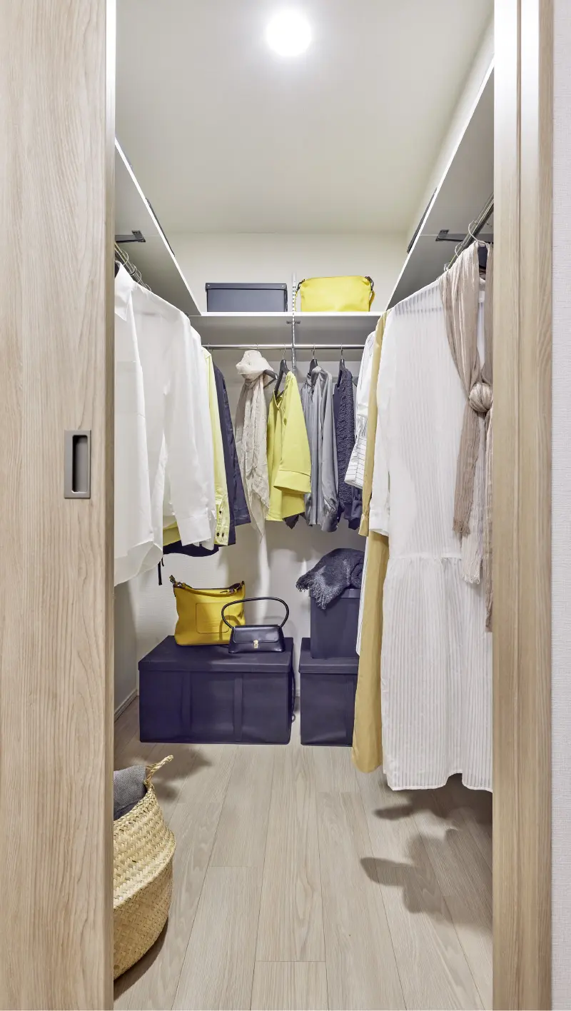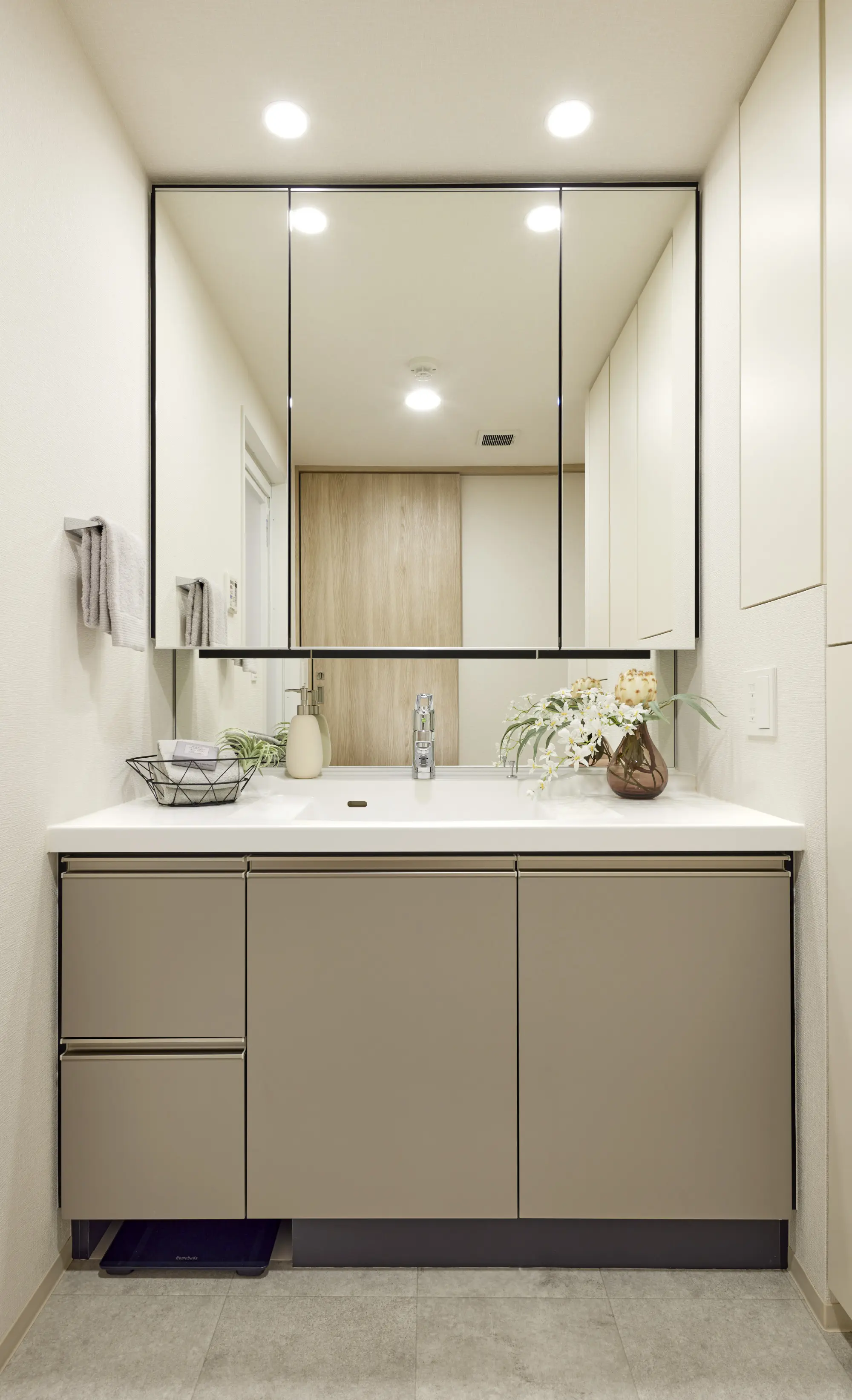 洗面室には小物やタオル類の収納に便利なリネン庫を設置。バスタイムや身支度に便利で、空間をすっきりと演出します。