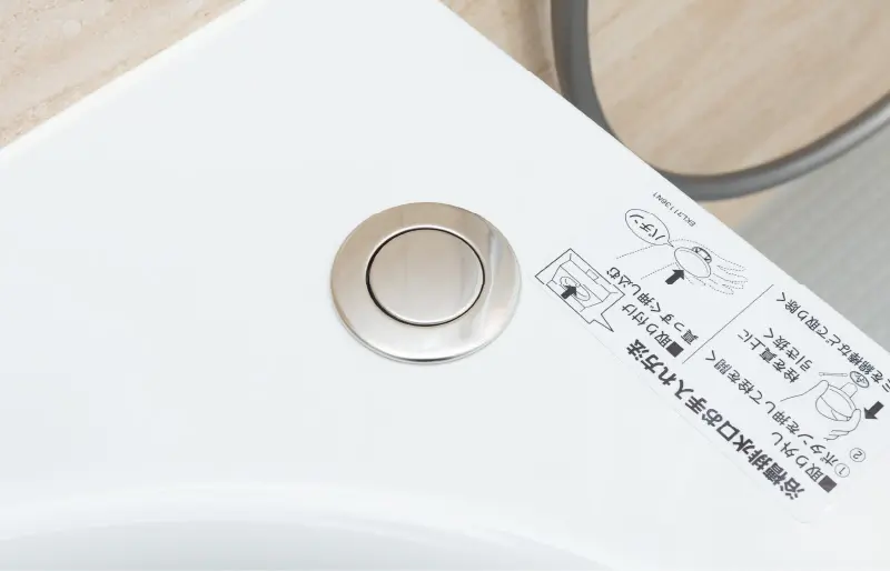 排水栓の開閉を浴槽リムのボタン一つで操作できます。水の中に手を入れるゴム栓に比べ、ボタンを押すだけなのでスマートです。
