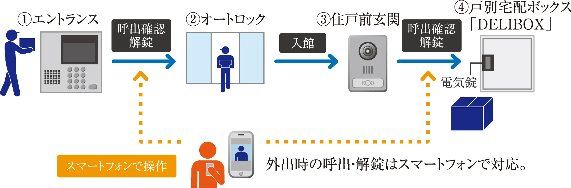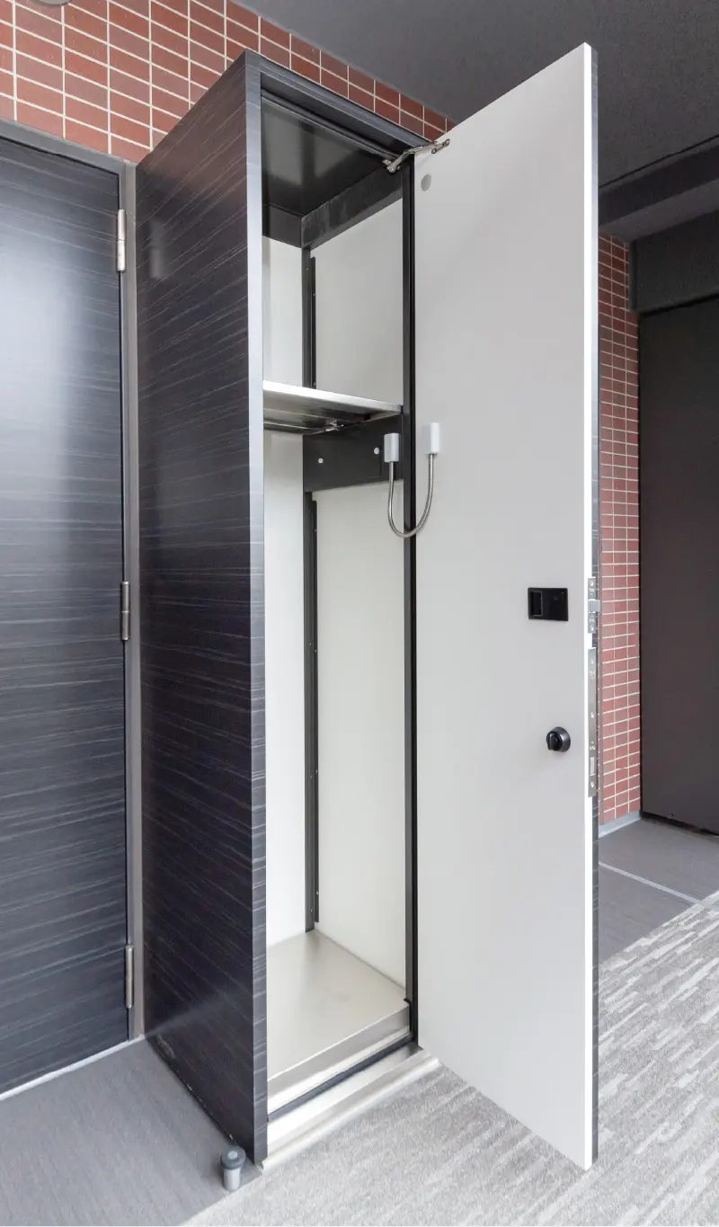 全戸の玄関脇に設置。不在時でもインターホン連動スマホアプリで宅配の各種荷物はもちろん、ゴルフバッグの受け取りも可能です。