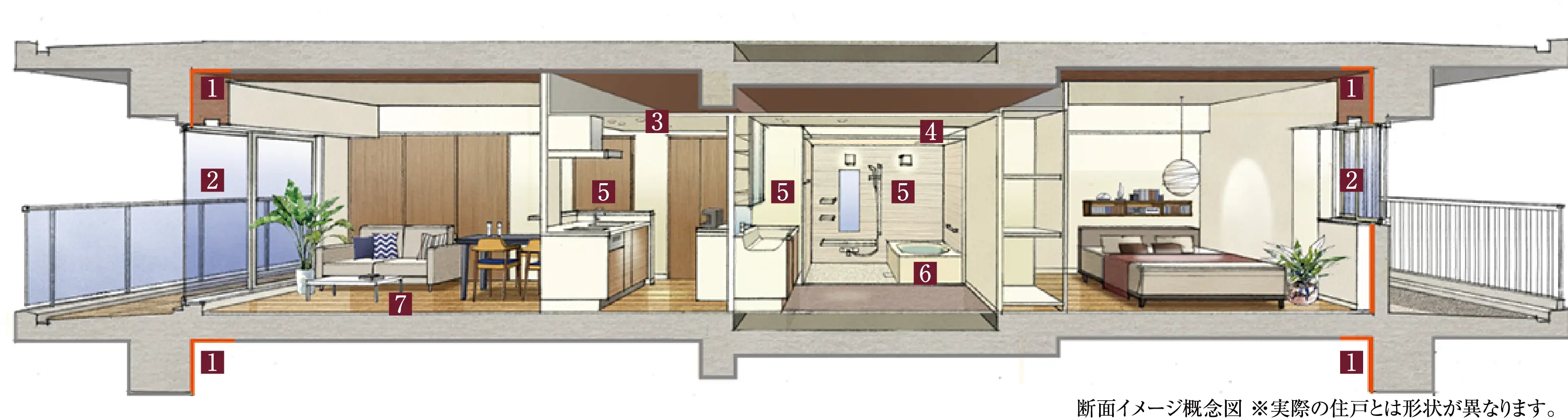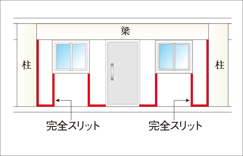 “建物の支え”となっていないバルコニー側・廊下側等の非構造壁の適切な部位にスリットを設けることで、柱と梁を地震による破壊から守ります。※一部除く