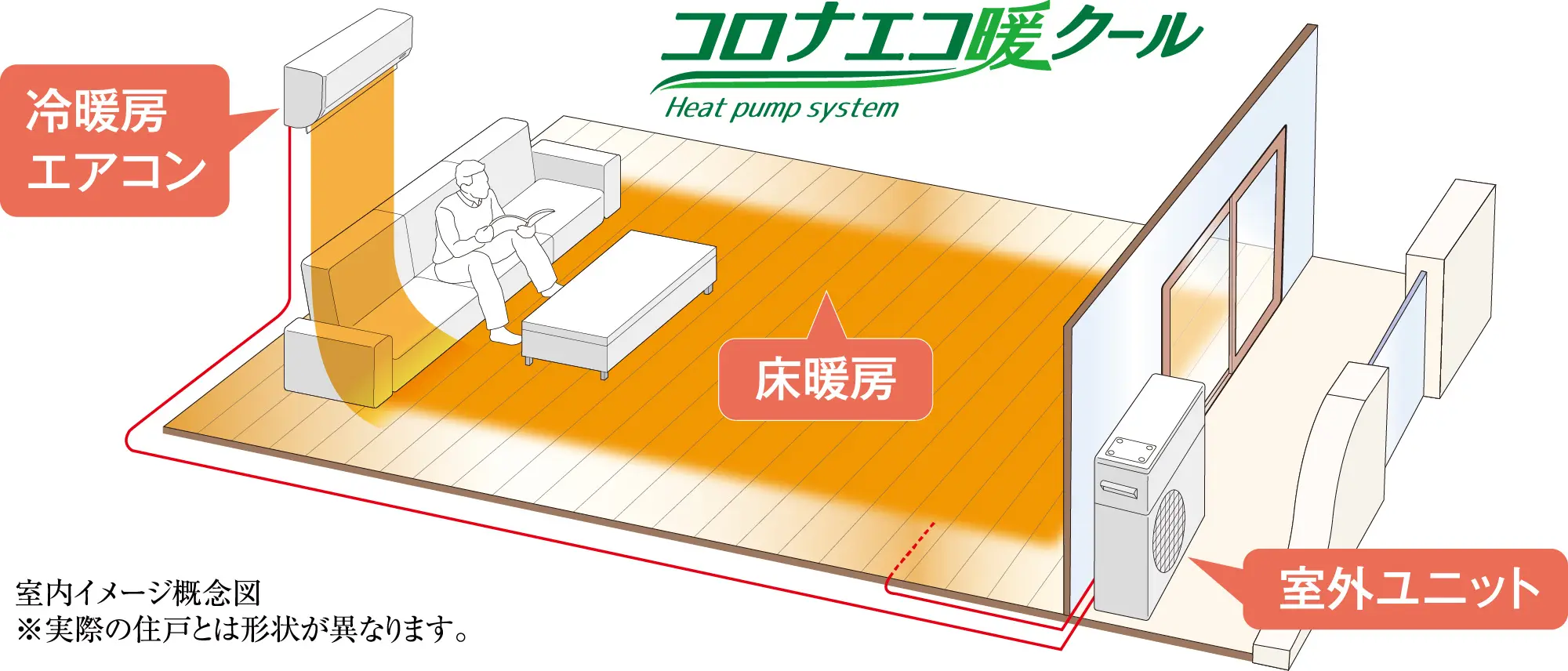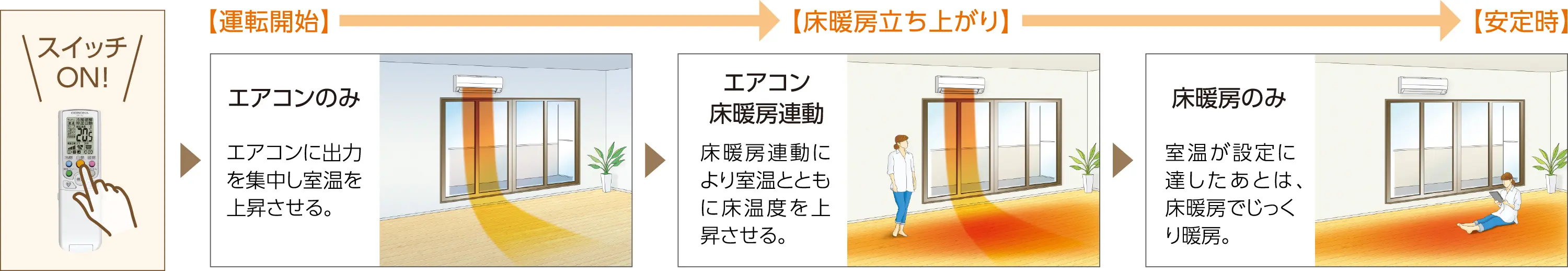 エアコンと温水式床暖房との連動で、室内をすばやく温め消費電力を低減。運転開始時はエアコンで暖房、しばらくするとエアコンと床暖房の連動運転へ。設定温度に達した後は床暖房のみの運転に切り替わります。