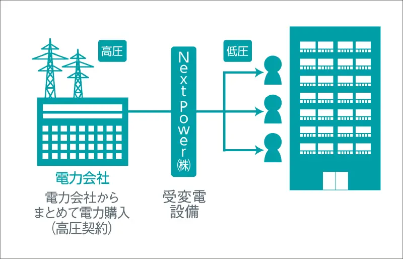 マンション全体の電気を高圧電力で一括購入し、低圧に変圧して配電。地域電力会社(東京電力エナジーパートナー)と比較して、お安く電気をご利用いただけるサービスです。