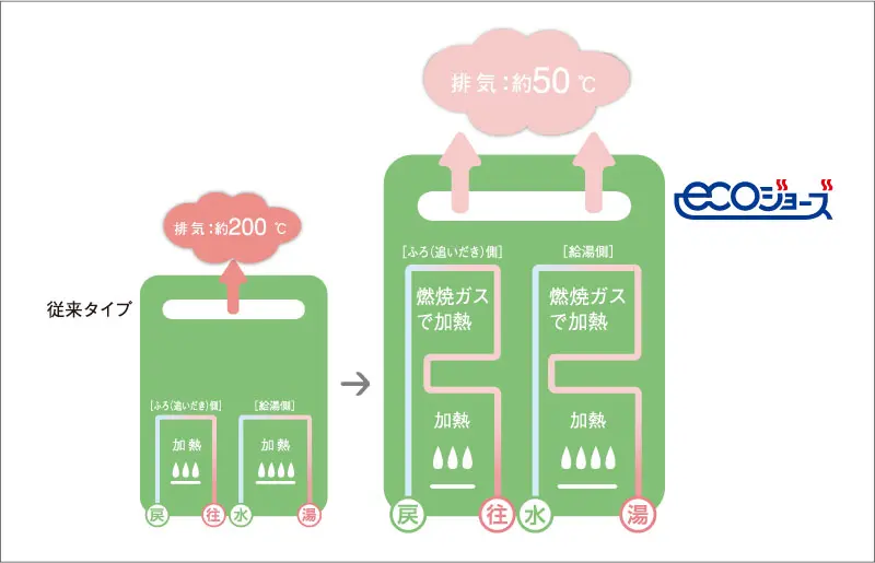 もったいないを再利用。今まで捨てられていた排気ガスの熱を再利用します。ムダは極力減らしてお湯をつくります。