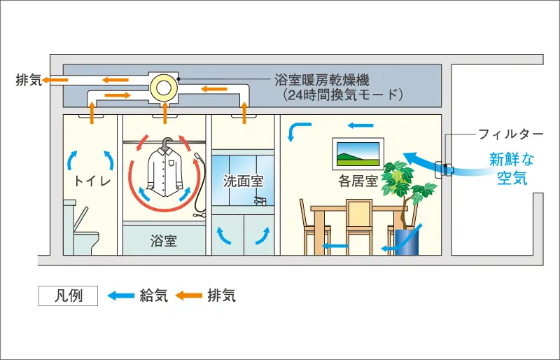 住戸内にフレッシュな空気を取り入れ、汚れた空気を排出する24時間低風量換気機能を浴室暖房乾燥機に搭載しています。
