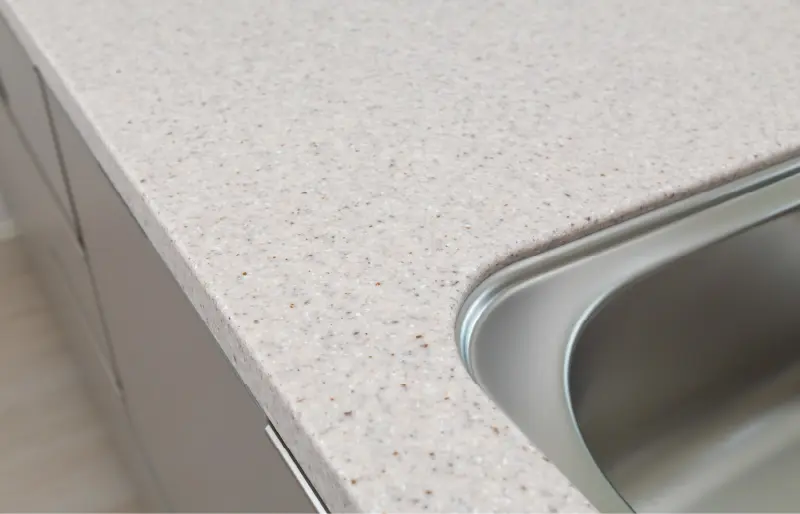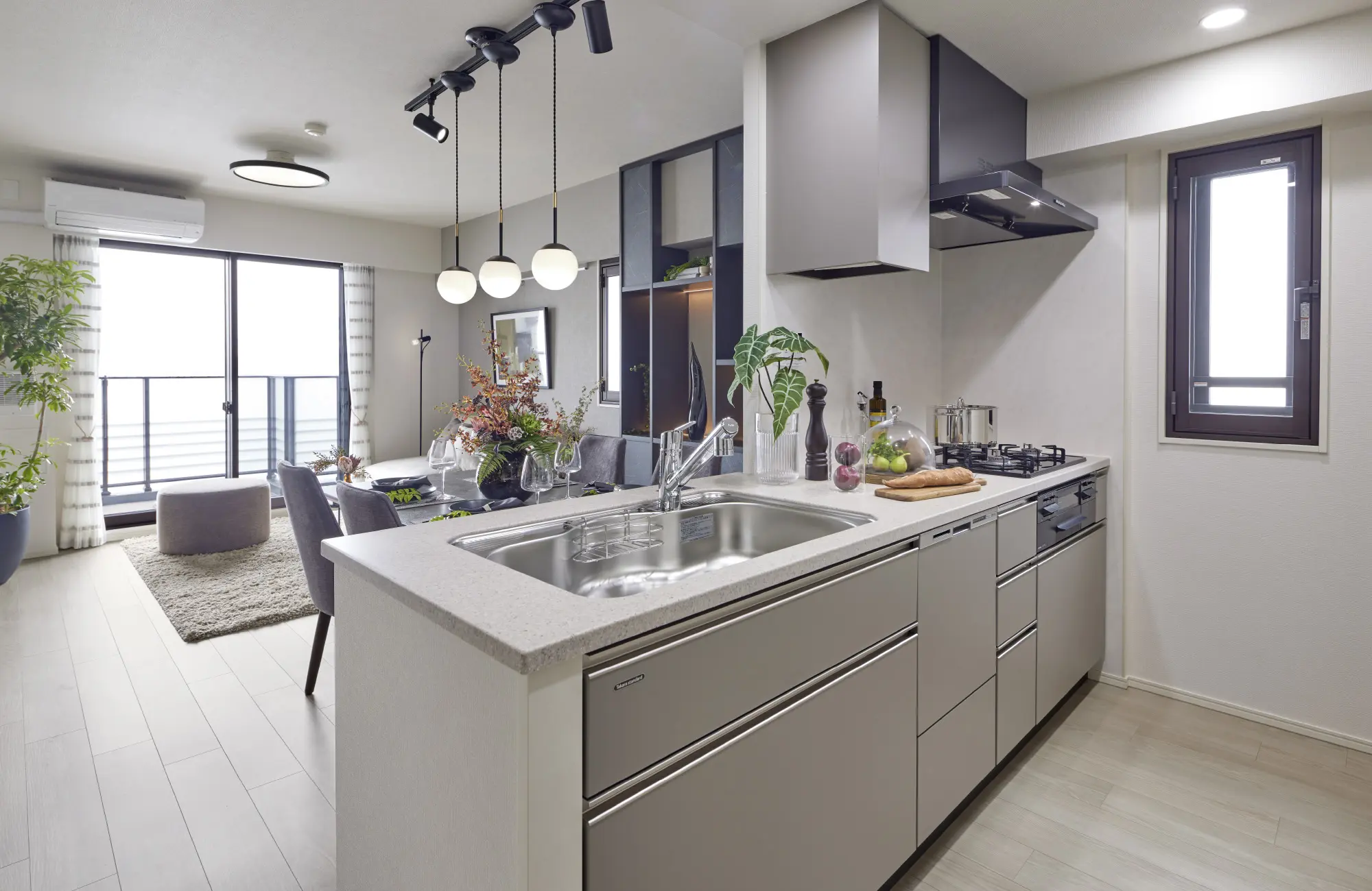 キッチンは清潔感と高級感がある人造大理石のカウンタートップ。耐久性に優れ、さっと拭き取るだけで汚れが落ち清掃も簡単です。
