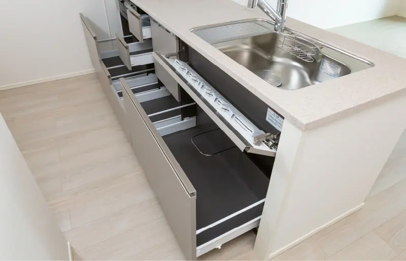 キッチン・スライド収納のレールにBlum社製のブルモーションを採用。引出しを強く押しても静かに閉まる、安全な仕様です。