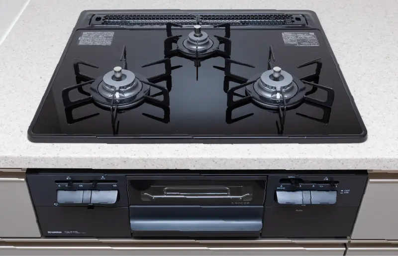 見た目の美しさに加えて、耐火性・耐久性に優れ清掃もしやすいガラストップコンロを採用。調理しやすい三口コンロです。※Kタイプ除く