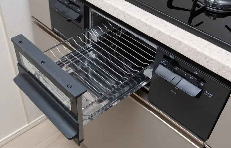 上下のバーナーで両面を同時に加熱。水を入れたり、食材を返す手間もなくスピーディーに焼き上げる調理に便利なグリルです。※Kタイプ除く