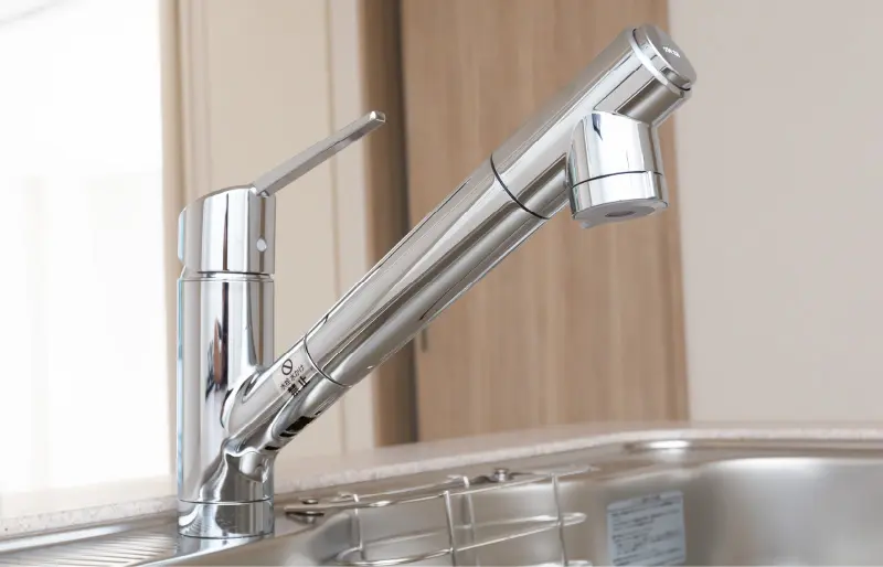 浄水・原水、ストレート・シャワーの切り替えが簡単にできるデザイン性の高い浄水器一体型水栓を採用。水栓を引き出せるのでシンクの隅々まで洗えます。