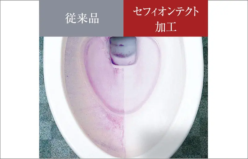 陶器表面の凹凸を100万分の1mmのナノレベルでツルツルにすることで、汚れが付着しにくく、落ちやすい便器を実現しています。