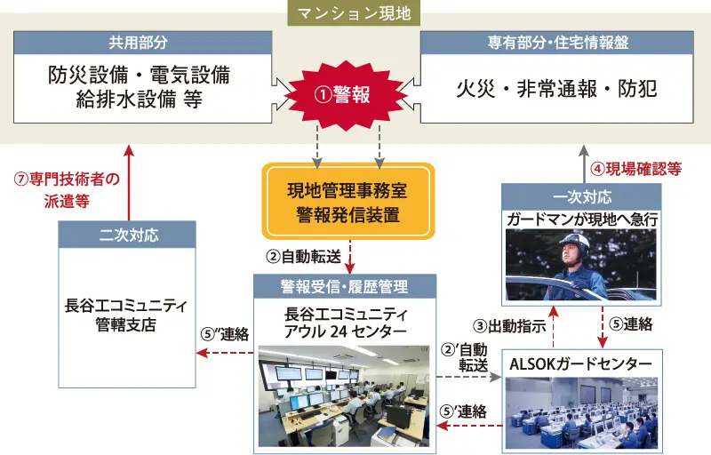 セキュリティ会社との連携により、緊急時にはガードマンが出動する体制を整備しています。