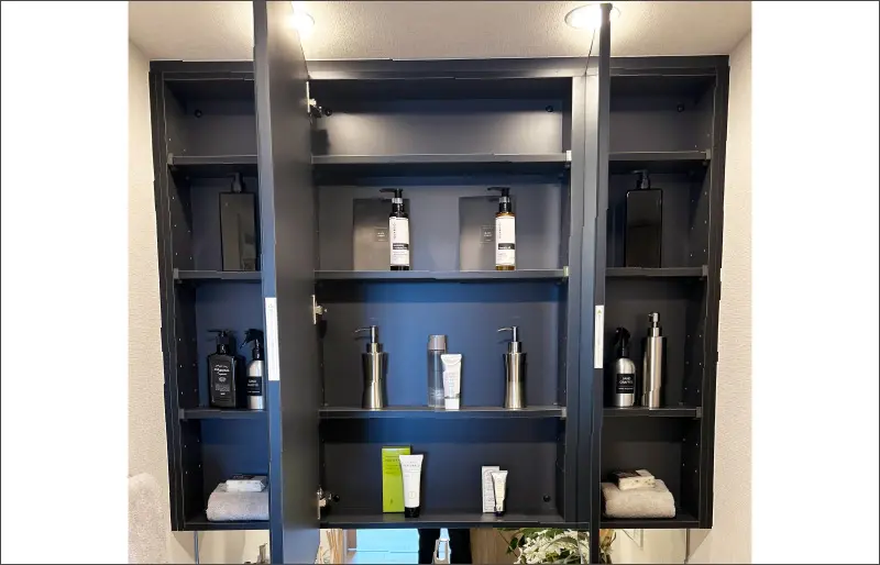 化粧品や身支度のための小物収納に便利な鏡裏収納付の大型三面鏡。