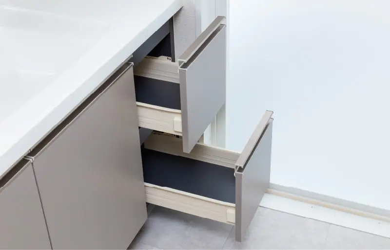洗面化粧台下部には、スライド収納と、バケツ等の収納に便利な開き扉収納を設置。