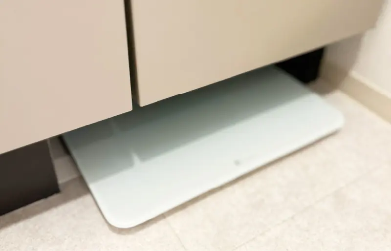 洗面化粧台の下部には、置き場所に困るヘルスメーターをすっきり収納できるスペースを確保しました。