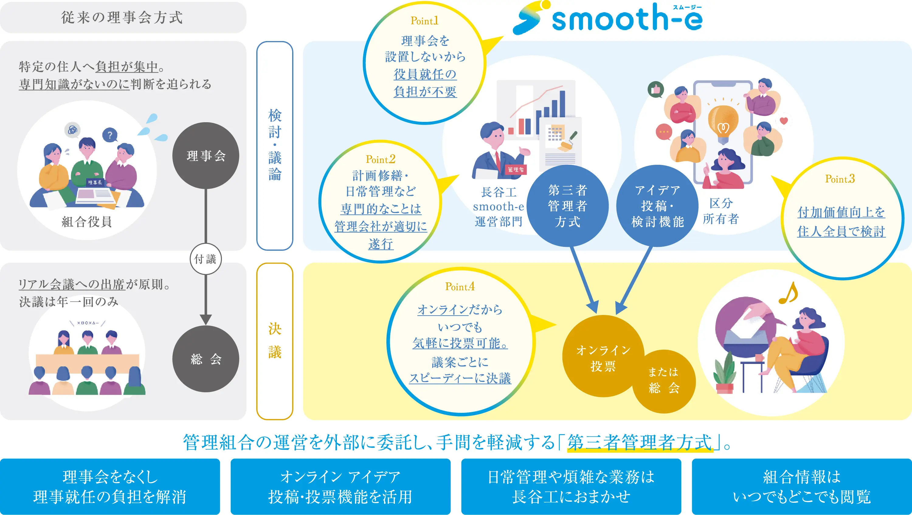 マンション管理の新しい形「smooth-e」を導入。たくさんの人が同じ建物で暮らすマンション。住人みんながマンション管理を考え、関わることができればもっとよい暮らしが実現できるはず。そんな新しい管理組合のあり方を目指すのがsmooth-eです。