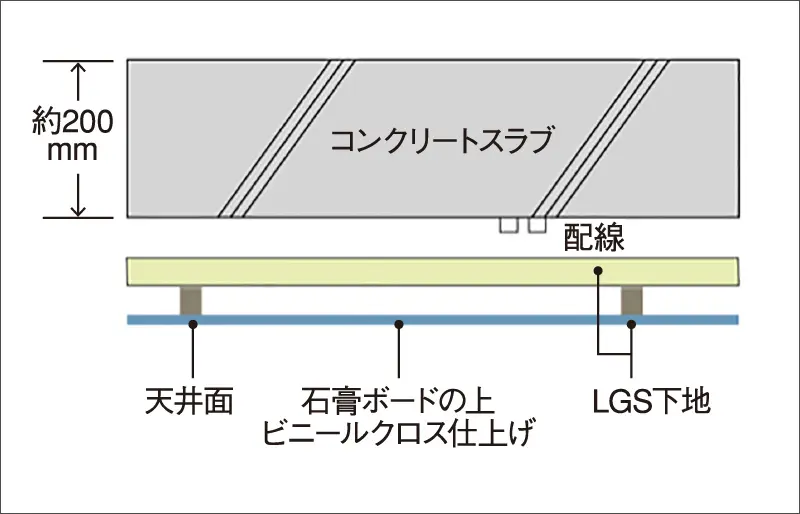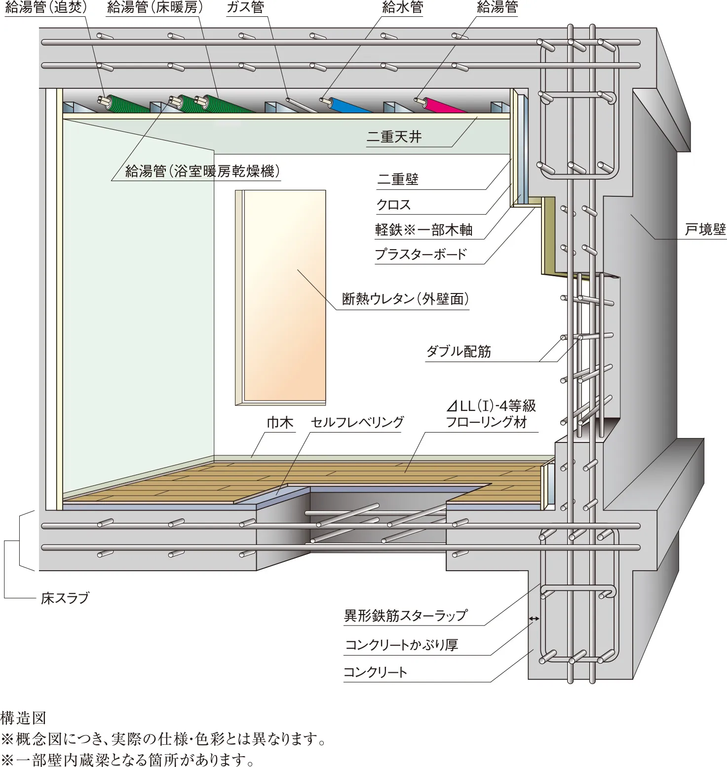 クロスをスラブに直接貼らない二重天井とすることで、配管・配線なども天井裏に配し、メンテナンスやリフォームを容易にしています。※一部除く。