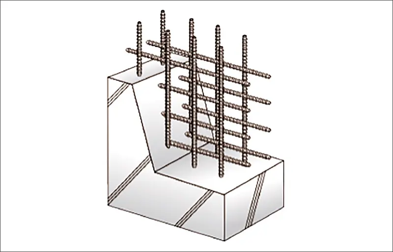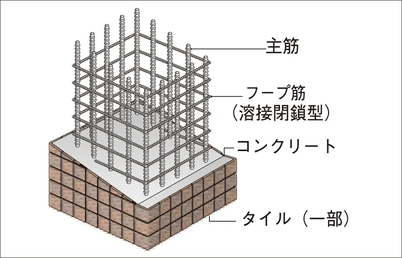 鉄筋コンクリート柱の内部に入れる帯筋の継ぎ目を溶接することで、柱自体の粘り強さを向上させて耐震性を高めています。※一部除く