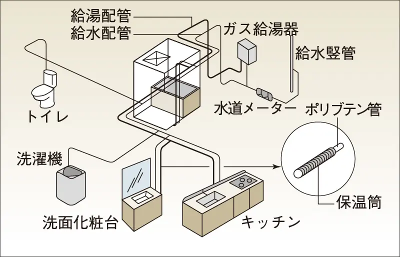 従来の配管材料である「亜鉛メッキ鋼管」や「硬質塩化ビニールライニング鋼管」で問題になっているサビの発生について、配管材料に樹脂製の架橋ポリエチレン管を使用することで、住棟内の赤水発生を防ぐことができるようになりました。