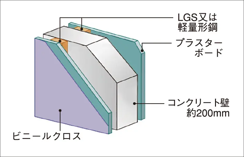 隣戸からの生活音に配慮して、住戸間の戸境壁の躯体厚さは約200mm以上を確保したうえ、遮音性を高めるプラスターボード貼りとしています。※一部除く