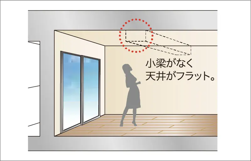 PC鋼線でスラブのたわみを防ぐと共に、室内に小梁が出ない開放的な空間を演出します。※一部タイプには小梁があります。
