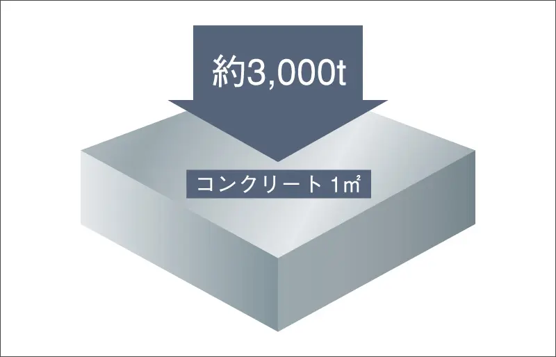 約30N/㎟以上の設計基準強度を持つ高い強度のコンクリートを採用。1㎡あたり約3,000tの圧縮に耐えられる強度です。※一部除く。