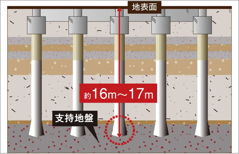 敷地の支持地盤は、地表面から約16m以深の砂礫層となっています。この層に対し、「杭底アースドリル工法」により支持杭を合計34本打ち込んでいます。
