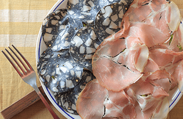 どれをいただいても間違いない!と地元でもファンが多いイタリアレストラン。マスターの岩永賢一さんがその目で確かめ厳選する食材はもちろん、塩やソースにもこだわり、ハムもすべてが自家製になっています。写真は雲仙のモモ肉を使い、竹炭とパルミジャーノ、クミンを入れたボイルハム。ほんのりクミンの香りが漂い、口の中で溶けていきます。