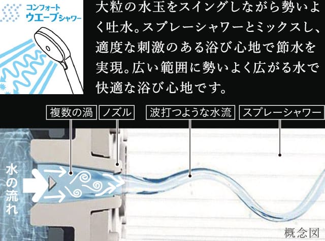 適度な刺激のある浴び心地で「節水」を実現。従来のシャワーと比較すると約35%(当社比)節水しながら、たっぷりの浴び心地が体感できる新しいシャワーです。