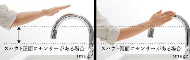 設計試作を繰り返す中で、センサーの設置位置によって操作時の肘の位置、腕の動きに変化が見られることが分かりました。スパウト側面にセンサーがある場合は動作時に腕を高く持ち上げる必要がなく、また、腕をひねる動作も軽減されることが分かります。(LC試作品による動作モニタリング)