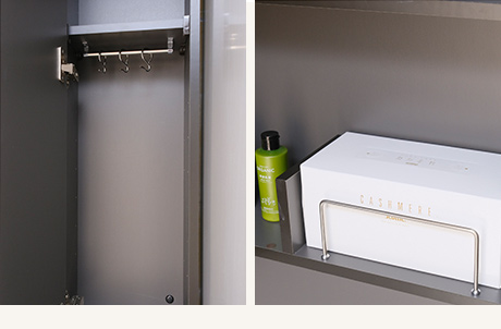 収納スペースの奥まで無駄なく使えるスライド収納を採用。重い物を入れてもスムーズに引き出せます。さらにキッチンスペースを無駄なく利用した収納が、細かな器具や調味料までスッキリと納めます。