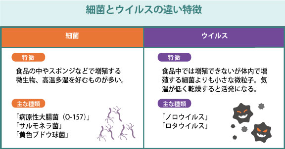 食中毒には「細菌性食中毒」と「ウイルス性食中毒」の2種類があります。両者は似たものと捉えられることもありますが、性質は全く異なります。