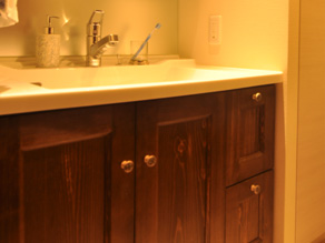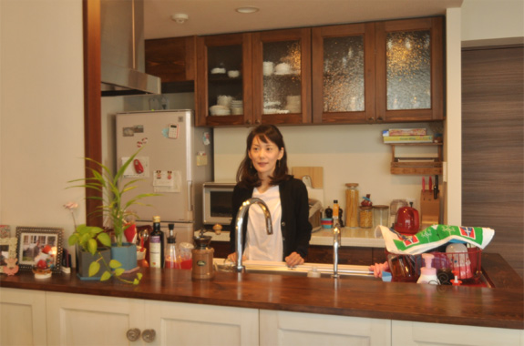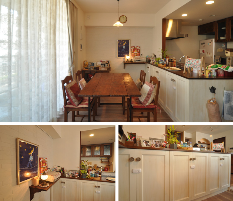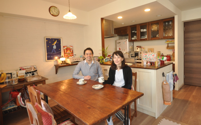 そんなお二人が大きくこだわったのが、ダイニングやキッチンをはじめ、洗面室の収納扉、寝室のサッシュ枠に至るまで、木材によるアンティーク調に統一したこと。入居前に行われたリフォームは、「アンティークの木材を扱う専門店と、リフォームを手掛ける施工会社の双方に、思い描いたデザインを相談し、お互いに協力していただくようお願いをしました」とのこと。近所ということもあり、リフォーム中は何度も顔を出して完成を心待ちにしていたそうです。
