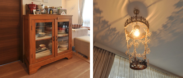 隅々までアンティーク調で統一された、こだわりのインテリア。実は、その基調となっている色合いがありました。「以前から使用しているお気に入りのアンティークの食器棚があるのですが、実は今回のコーディネートは、すべてこのアンティークの食器棚の色調が基本となっています」と奥様は語ります。ご夫婦の想い出にもなっている家具をベースとすることで、購入時のスタンダードなお部屋が、いつまでも慈しむことのできる、どこか懐かしい場所へと変貌を遂げました。