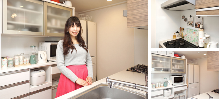 キッチンに「ビルトインの食洗機があるのは嬉しかったです」と奥様。ゲストを招いてホームパーティーをすることもあるらしく、そんな時に食洗機が大活躍するそうです。なお、キッチンの収納棚は、偶然にもサイズや色、デザインなどがジャストフィットするものを店頭で見つけて購入。収納力をアップさせたことでキッチン周りを綺麗に整頓することができているようです。キッチンパネルにマグネットでレシピを貼るなど、使い勝手の良さも感じられます。